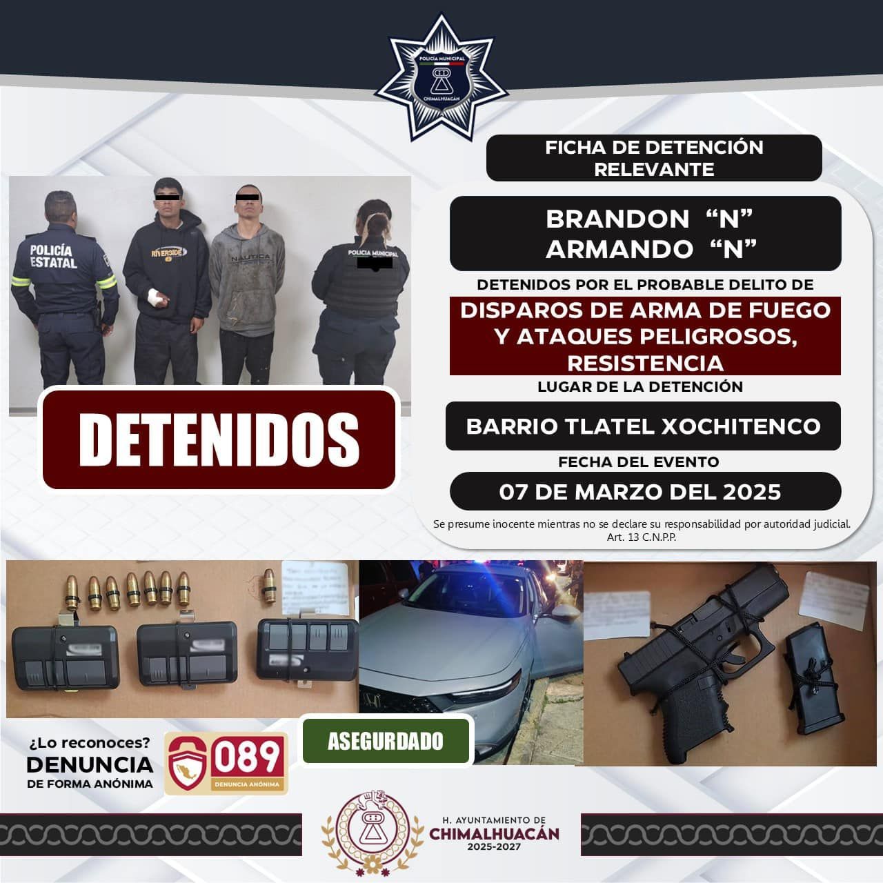 CHIMALHUACAN, MÉX., a 14 de marzo de 2025.- Luego del trabajo conjunto de la Dirección General de Seguridad Ciudadana y Tránsito Municipal de Chimalhuacán y de la policía estatal, Brandon ’N’ y Armando ’N’ fueron detenidos y puestos a disposición de la Fiscalía General del Estado de México por presuntamente dedicarse al robo de vehículos en el municipio. Durante la detención les fueron asegurados un arma de fuego, cartuchos y diversos controles replicadores de frecuencia.