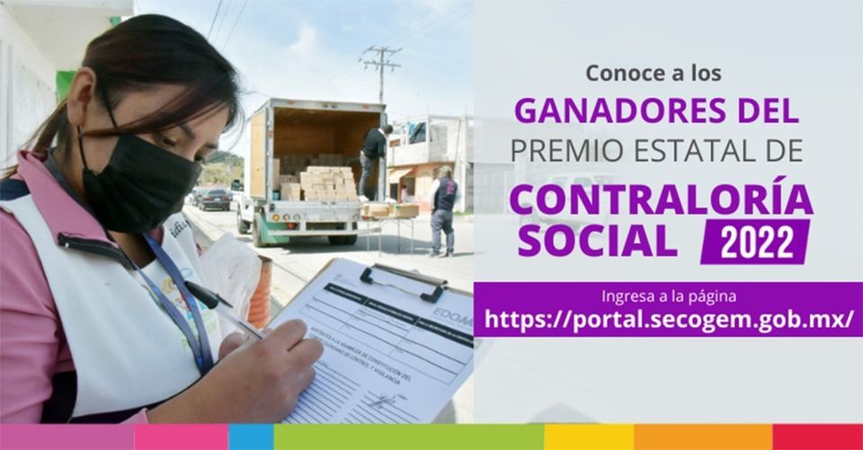 Toluca, Estado de México., 30 de agosto de 2022.- El Gobierno del Estado de México, a través de la Secretaría de la Contraloría, da a conocer a los ganadores del Premio Estatal de Contraloría Social 2022 en sus dos categorías: ’Acciones de los Comités de Contraloría Social’ y ’Acciones de Vigilancia Ciudadana en la Gestión Pública’.