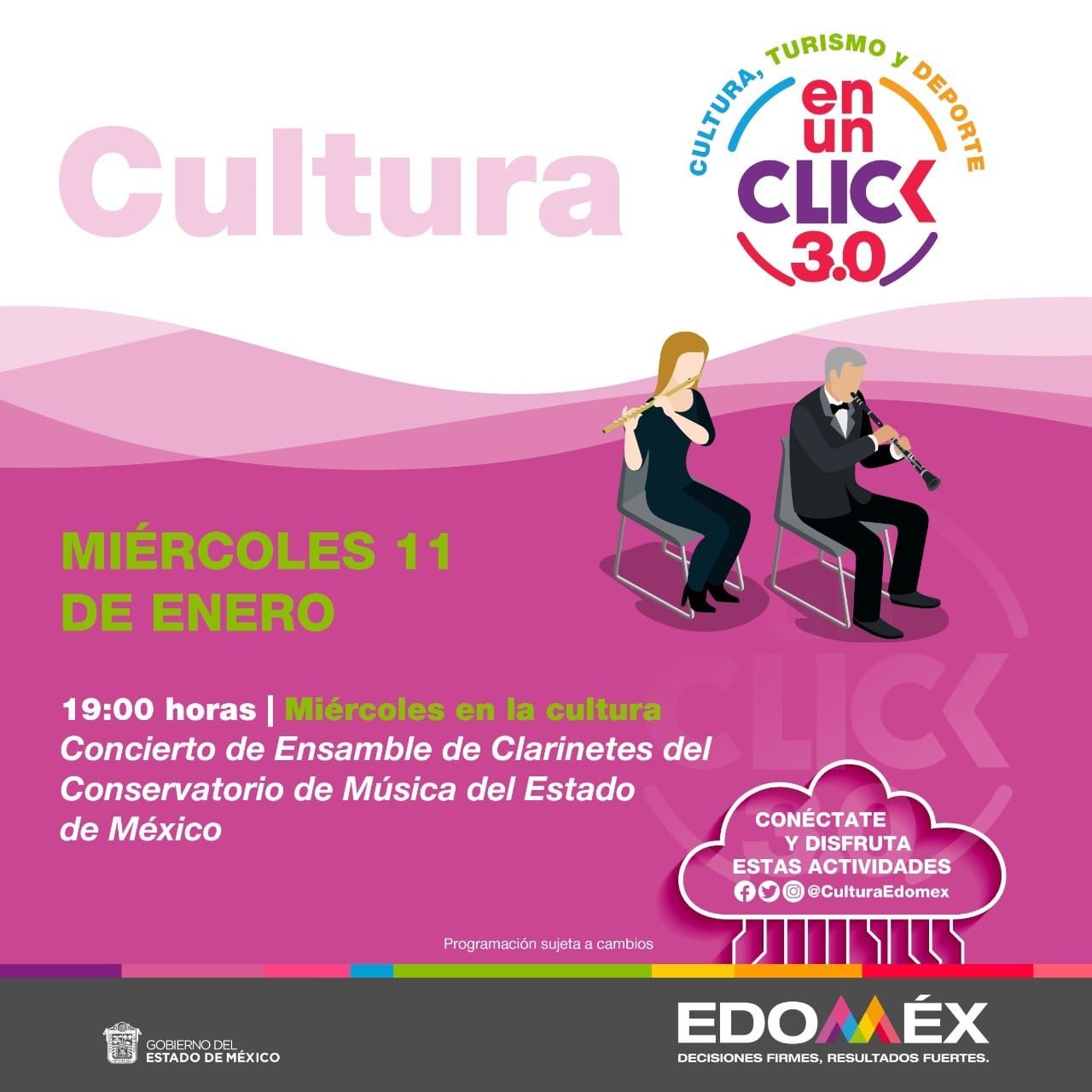 Los miércoles en estas redes son culturales, por ello, el 11 de enero a las 19:00 horas invitan al concierto de Ensamble de Clarinetes del Conservatorio de Música del Estado de México, proyecto extracurricular escolar, donde Austreberto Méndez busca impulsar la música de cámara a los jóvenes alumnos y exalumnos de la cátedra de Clarinete.
