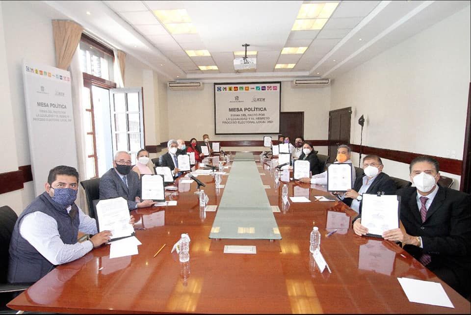TOLUCA, MÉX., 12 de mayo de 2021.- Durante la cuarta sesión de la Mesa Política, realizada el día de hoy, las y los dirigentes de los 11 partidos políticos que participan en el proceso electoral local 2021, firmaron el Pacto por la Legalidad y el Respeto, siendo testigos de honor de este acuerdo, el gobierno de la entidad, a través de la Secretaría General de Gobierno y autoridades del Instituto Electoral del Estado de México (IEEM).