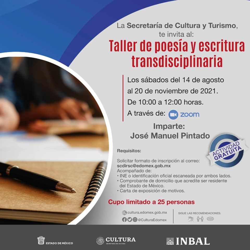 TOLUCA, MÉX., 10 de agosto de 2021.- Por iniciativa de la Secretaría de Cultura y Turismo estatal, el Taller de Poesía y Escritura Transdisciplinaria será guiado por el poeta, cronista y guionista de cine, radio y televisión, José Manuel Pintado.