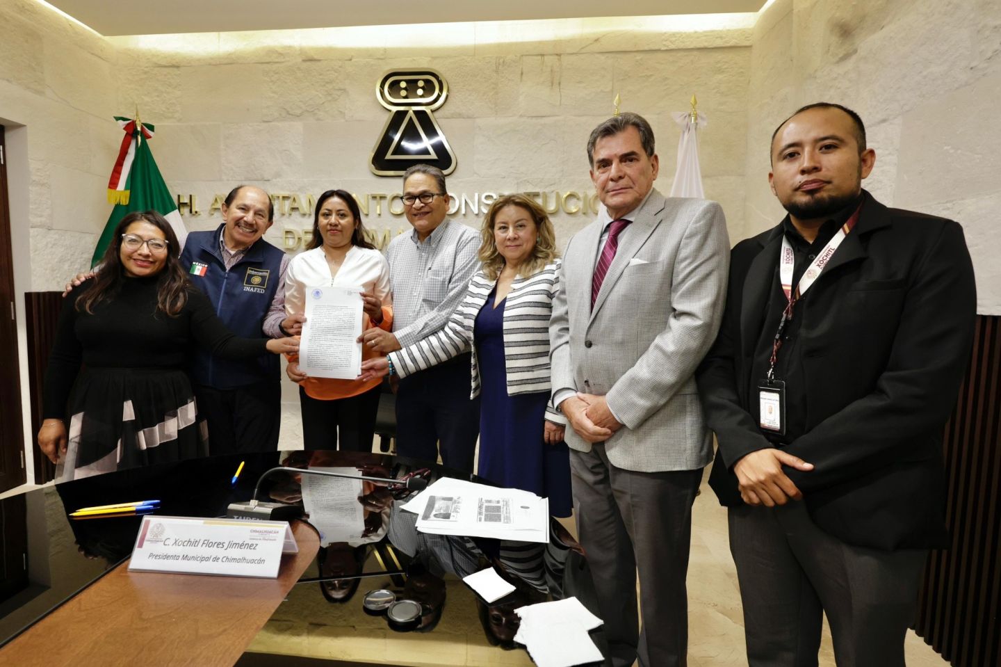 CHIMALHUACÁN, MÉX., a 25 de agosto de 2025.- En la sala de cabildo del palacio municipal, la presidenta Xóchitl Flores Jiménez, acompañada del titular del Instituto Nacional para el Federalismo y el Desarrollo Municipal (INAFED), Armando Quintero Martínez, encabezó la firma ante notario público de la escritura y donación del predio donde se construirá el Hospital General de Zona (HGZ) Chimalhuacán.