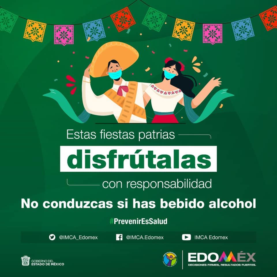 TOLUCA., 11 de septiembre de 2021.- Con la finalidad de hacer conciencia de las causas y efectos del consumo del alcohol, la Secretaría de Salud del Estado de México, a través del Instituto Mexiquense contra las Adicciones (IMCA), lanzó la campaña ’Estas fiestas patrias disfrútalas con responsabilidad’.