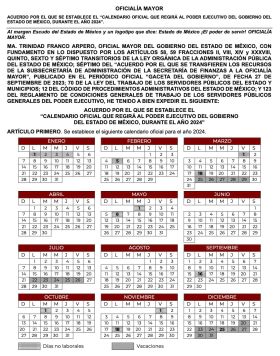 • Contempla 11 días no laborables y tres periodos vacacionales. • Invita Gobierno del Estado de México a consultar la información relativa en: https://legislacion.edomex.gob.mx/.../dic141/dic141h.pdf.