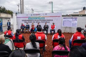 • Invierten 2.8 millones de pesos en el equipamiento del pozo profundo. • Instala la Comisión del Agua del Estado de México (CAEM) una bomba sumergible, con un gasto de 40 litros por segundo, 61 metros de tubería de acero y un tren de descarga.